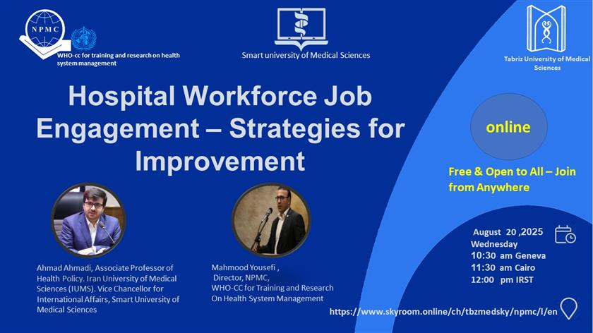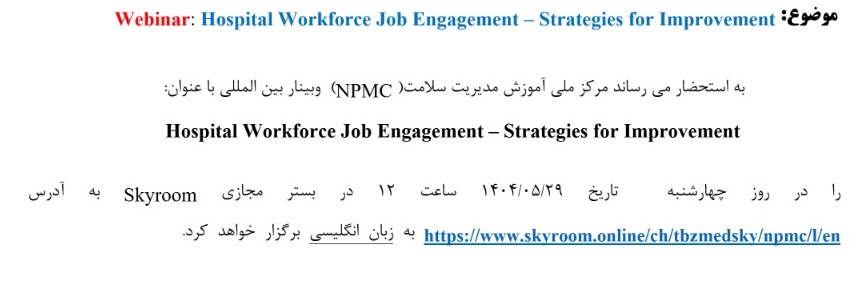 وبینار آموزشی بین المللی Hospital Workforce Job Engagement – Strategies for Improvement ۲۹ مرداد ۱۴۰۴ | ۱۰:۰۱ کد : ۵۳۹۲۵ اطلاعیه ارسال به دیگران نام شما ایمیل شما ایمیل دریافتکننده ارسال انصراف تعداد بازدید:۱۵۷۶ وبینار آموزشی بین المللی Hospital Workforce Job Engagement – Strategies for Improvement